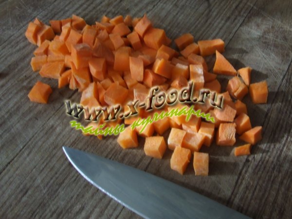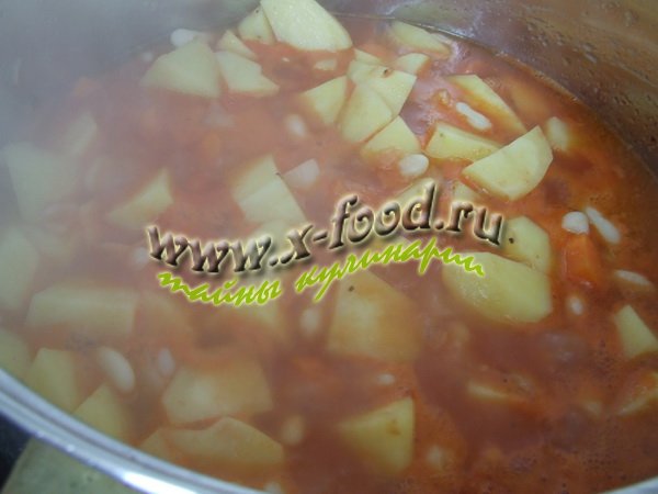 2. Лук и морковь необходимо почистить, нарезать не очень мелко. Обжарить на растительном масле в достаточно крупной и ёмкой посуде (кастрюле или сковородке). Картофель промыть, почистить, нарезать ломтиками среднего размера. Добавить в обжаренным овощам, все вместе еще раз обжарить, немного совсем. Также нужно положить в общий котел отваренную фасоль.