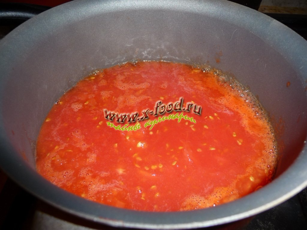 Свежие помидоры очистить от кожицы. Это делается так: на них нужно слегка надрезать кожицу и опустить в кипяток на 1-2 минуты. После этого помидоры легко очистятся и их можно будет измельчить для соуса с помощью блендера. Обязательно нужно вырезать жесткую часть от плодоножки. Томатное пюре можно протереть через металлическое сито, чтобы избавиться от семян.
