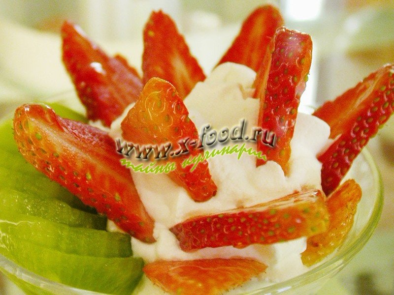 2. На дно фиалки (или любой другой емкости) выложить 1/2 часть мороженого, наверх 1/2 часть киви, поверху налить взбитую клубнику.