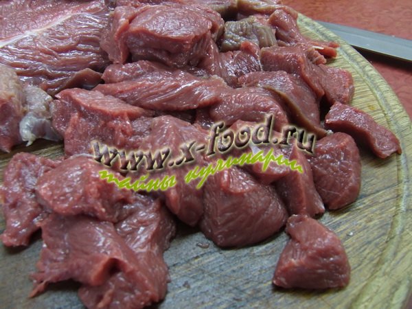 2. Мясо хорошенечко промыть под проточной водой, обсушить полотенцем. Нарезать небольшими кусочками (примерно на один укус). Обжарить телятину на сковородке с добавлением растительного масла до небольшой румяной корочки.