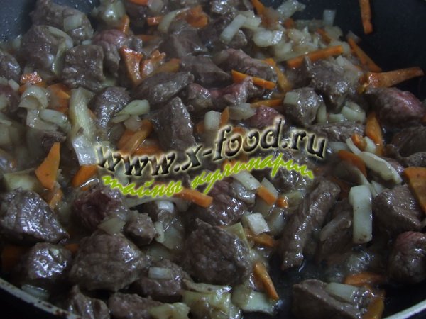 3. Далее необходимо добавить к мясу измельченные лук и морковь, также обжарить все вместе до золотистого цвета овощей.