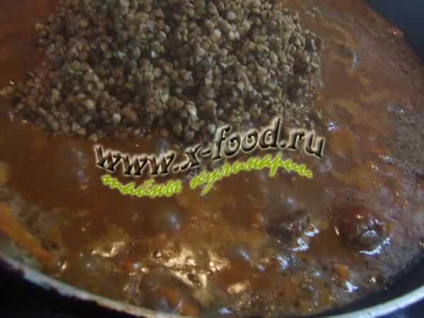 4. На следующем этапе гречневую крупу нужно тщательно промыть, удалив всплывающий мусор (веточки, пустые крупинки), слить всю воду и положить на сковородку к мясу и луку с морковью.