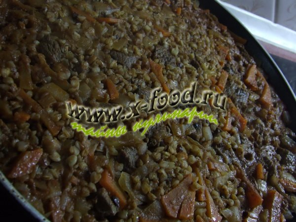 7. Уменьшить огонь и томить блюдо на самом маленьком огне в течение 30-40 минут до полной готовности мяса и гречневой каши.