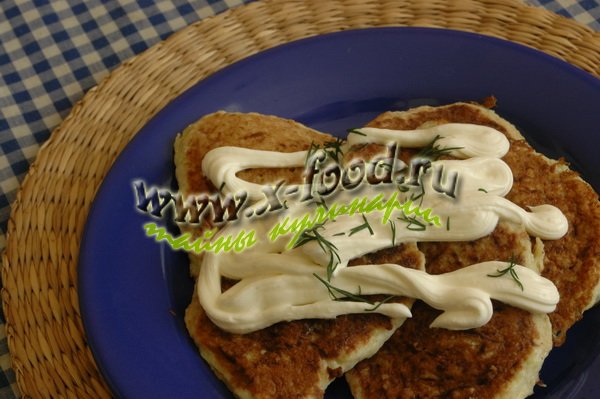 6. Подавать со сметаной или с майонезом. Оладышки вкуснее в охлажденном виде, но это на мой вкус. Посыпать при подаче измельченной зеленью.
