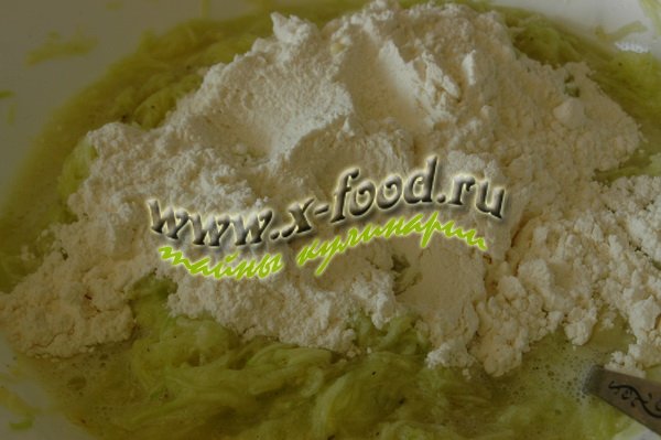 2. Отделить белки от желтков, добавить желтки в кабачковую массу. Также положить соль, соду, муку и любимых специй по вкусу. Перемешать и отставить в сторону.