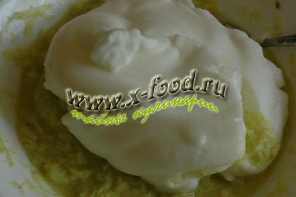 4. Далее полученную белковую пену добавить в кабачковую массу, перемешать. Добавить растительное масло и перемешать до однородного состояния (также по желанию можно добавить немного измельченной зелени).