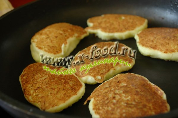 5. Выкладывать полученное тесто на горячую сковородку с добавлением небольшого количества растительного масла (лишь совсем немного, оладьи не должны плавать в масле, оно должно лишь немного придавать сочности оладышкам). Обжарить оладьи с двух сторон до румяного цвета.