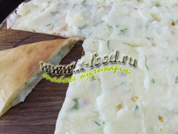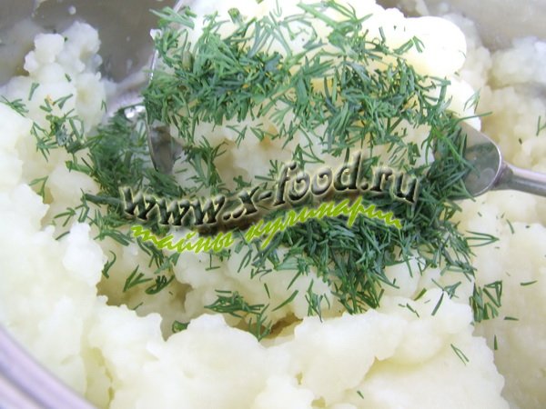 2. Картофель промыть, очистить, нарезать произвольно и отварить в подсоленной воде до готовности. Слить лишнюю воду и потолочь в не жидкое и не сильно сухое пюре. Добавить измельченную зелень укропа. Перемешать. Можно добавить щепотку черного молотого перца. Дать пюре остыть до комнатной температуры.