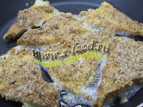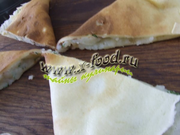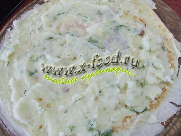 3. Далее необходимо на каждый блинчик по 2 ст.л. картофельного пюре и равномерно распределять по всей поверхности (в центре должно быть намного меньше пюре, иначе при сгибе оно будет вылезать). После нанесения пюре блинчик нужно разрезать на 4 части, крест-накрест. Каждую четвертушечку сложить пополам. Обмакнуть во взбытые яйца, запанировать в панировочных сухарях и обжарить на растительном масле до румяных бочков.