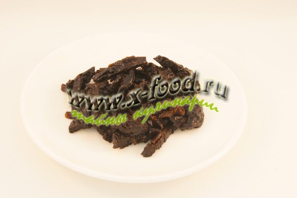 2. Чернослив необходимо замочить в кипятке на 15 мин, затем сполоснуть в чистой воде и нарезать соломкой.