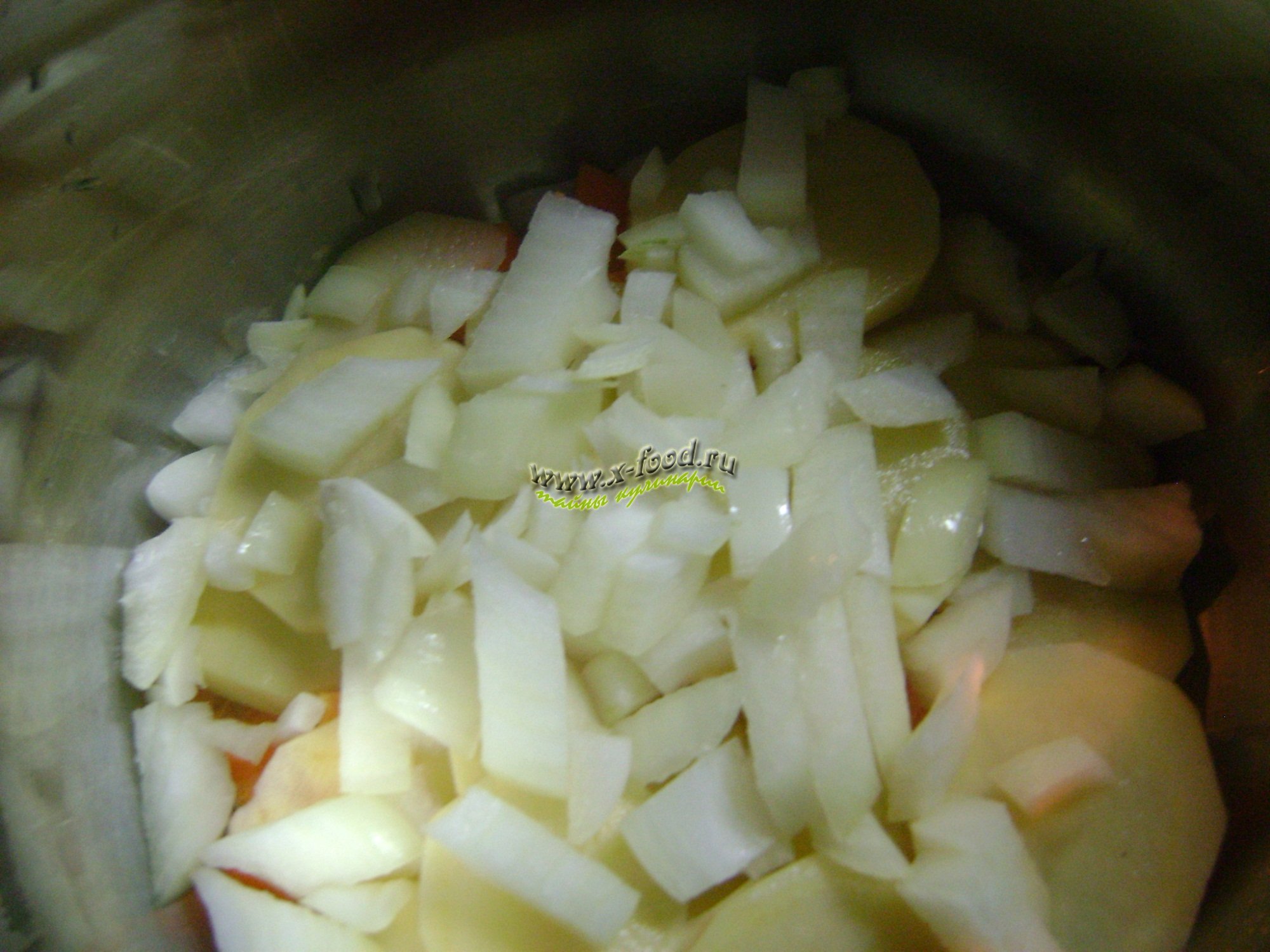10. После этого заливаем овощи кипятком с разведенным бульонным кубиком. Кипяток заливаем на всю кастрюлю, чтобы получился суп. Солим, перчим, добавляем приправы, даем закипеть и выключаем.
