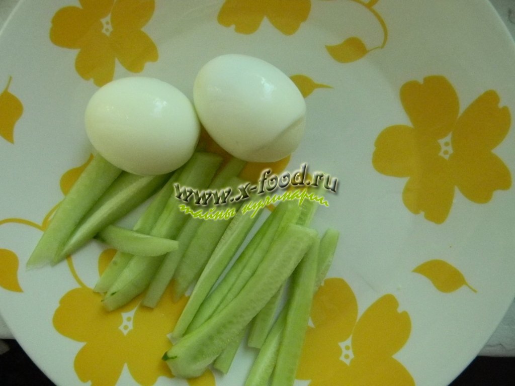 1.Отвариваем яйца, моем чистим от кожицы огурцы, нарезаем их соломкой.