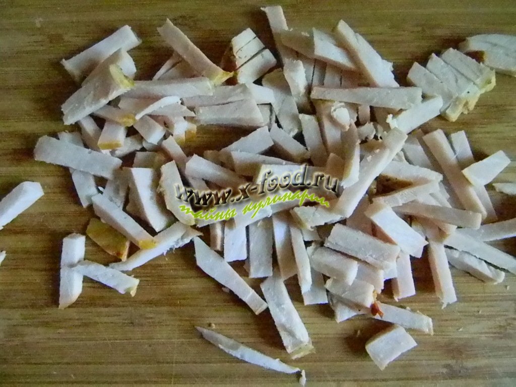 1. Порежьте мясо (не сырое, а любое запеченное) соломкой. Обжарьте в небольшом количестве масла на сильном огне.