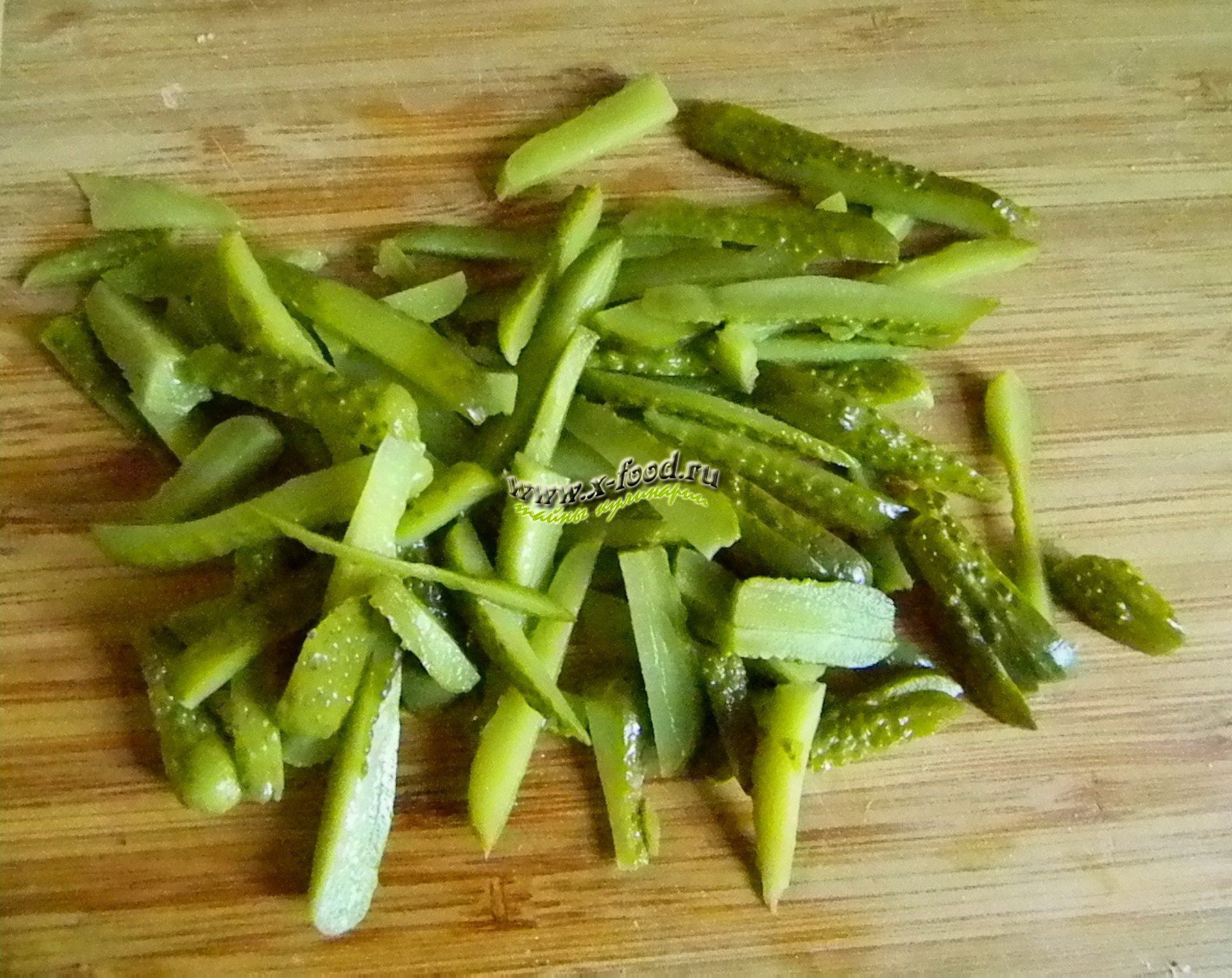 2. Порежьте соломкой маринованные огурцы.