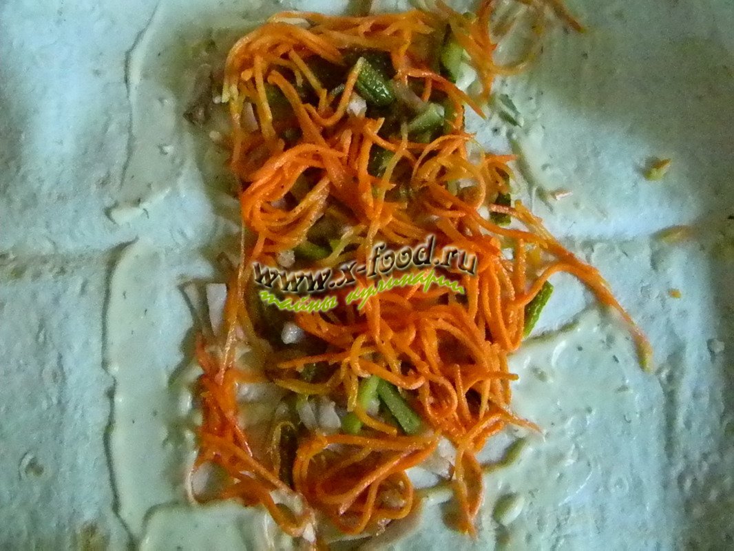 В центр выкладываем жареное мясо, маринованные огурцы и морковь по-корейски.
