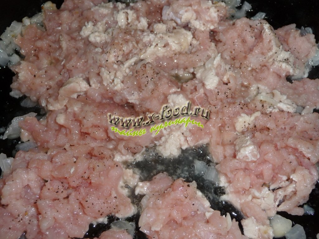 1. Индюшачий фарш поджарить на растительном масле на разогретой сковороде, посолить и поперчить. Остудить.