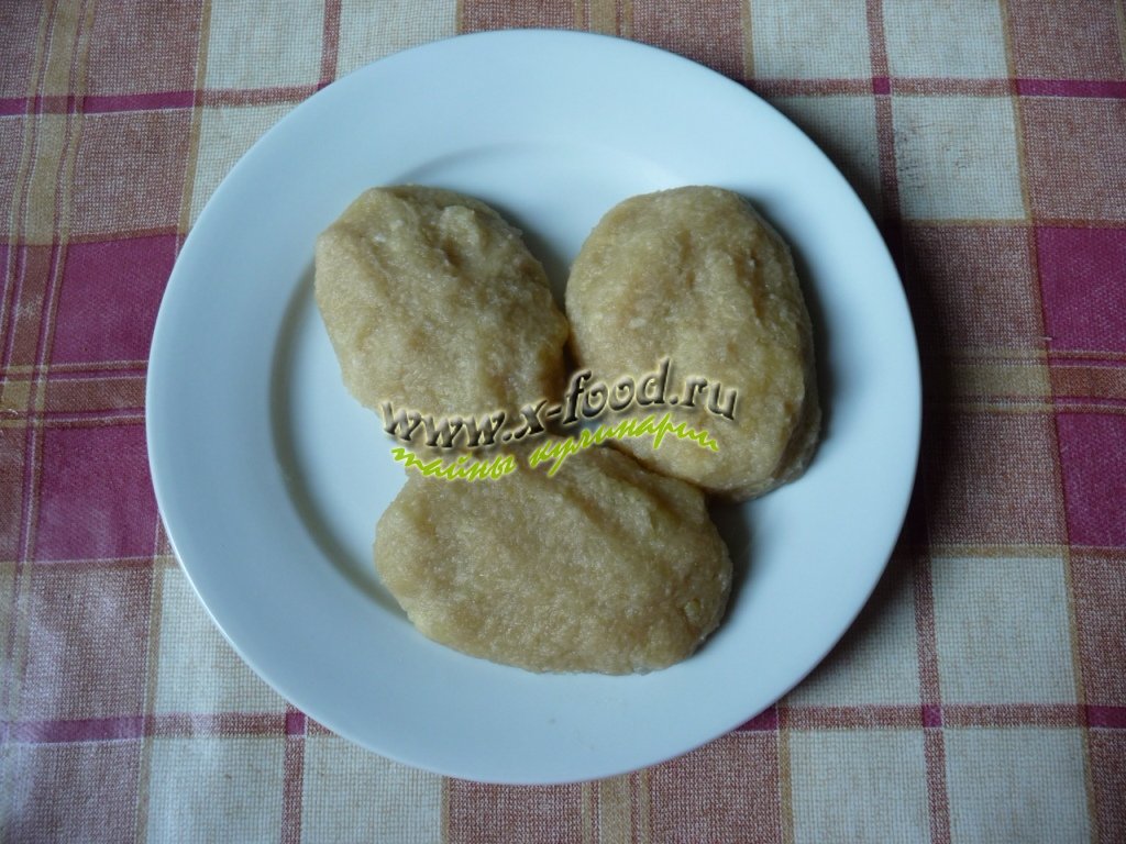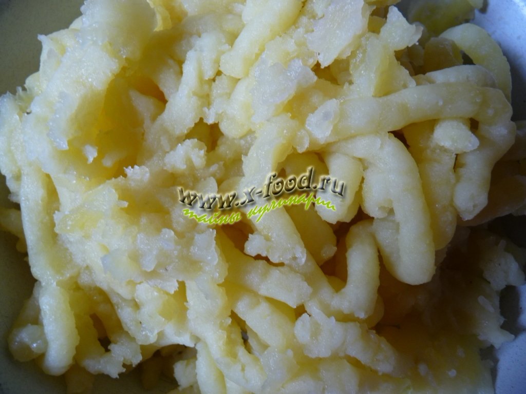 5 средних картофелин почистить, отварить в подсоленной воде и размять в пюре или пропустить через мясорубку.